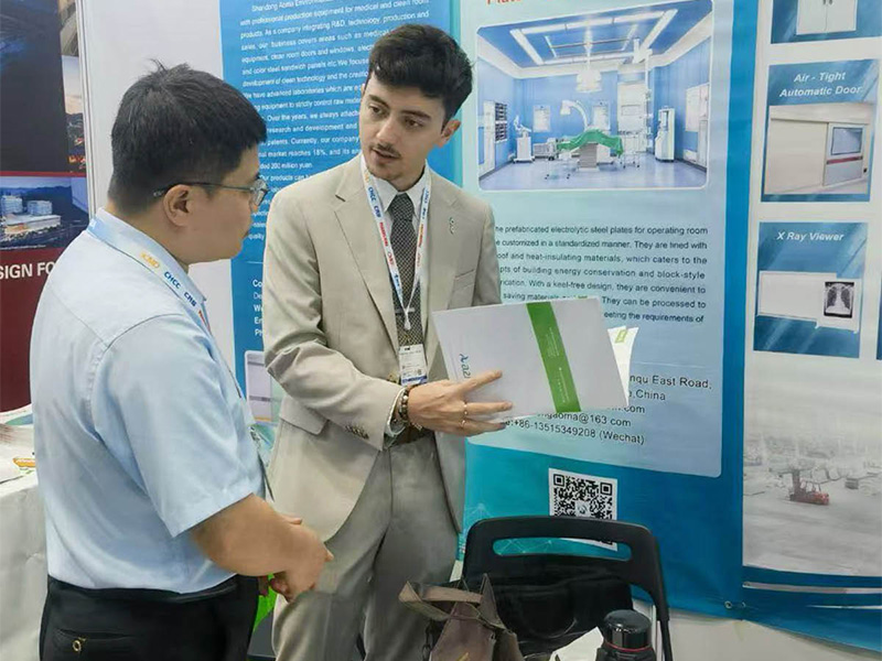Будучи ведущим предприятием в области медицинской очистки, ооо шаньдунская ома экологическая технологическая была приглашена на выставку и продемонстрировала ряд чистых продуктов, таких как ручная цветная сталь, механическая цветная сталь, модульная электролитическая сталь, сборочная электролитическая сталь, подвесная электролитическая сталь, чистые двери и окна, что привлекло внимание многих международных покупателей и партнеров и еще больше повысило международное влияние бренда.